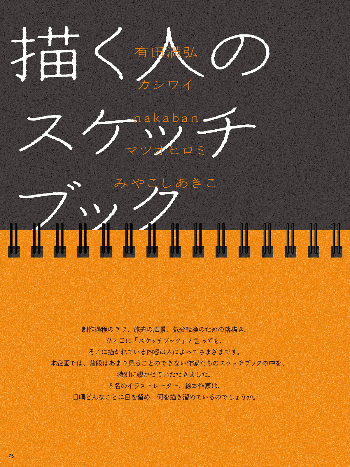 ひと口に「スケッチブック」と言っても、そこに描かれている内容は人によってさまざま。本特集では、普段はあまり見ることのできない作家たちのスケッチブックの中を特別に掲載。5名のイラストレーター、絵本作家は、日頃どんなことに目を留め、何を描き溜めているのだろうか。