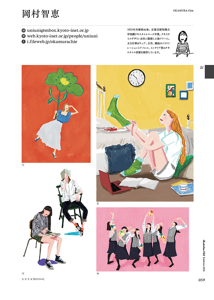 現在はアパレル、インテリア、雑貨等の生地柄のデザイン企画、図案制作と雑誌、広告、ウェブサイト等のイラストレーションを制作。